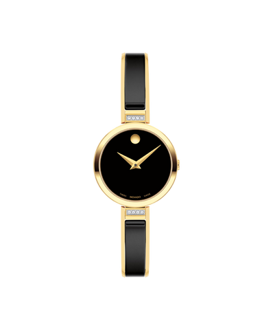 The Moda is defined by a slim, jewelry-inspired bracelet and our iconic Museum Dial. This 24mm watch features a black dial, yellow gold tone dauphine hands, and a ceramic-inlay bangle bracelet with diamond pavé lugs.