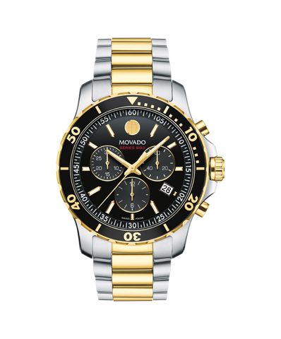 Movado Series 800, 42 mm stainless steel and yellow gold PVD-finished case and bracelet with black chronograph dial.