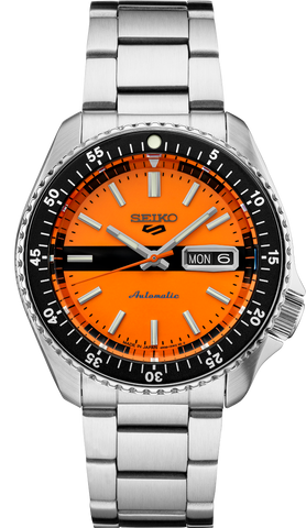 Seiko 5 Sports Special Edition. Inspired by the popular model 5126-6030 of the late-’60s, this dynamic watch offers current styling with a vintage feel, featuring an updated case and streamlined dial, while retaining the original’s orange and black color scheme. Framed by a black uni-directional rotating bezel, the orange dial includes a day/date calendar, red-orange second hand, black stripe accent,...