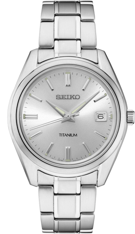 From the Essentials Collection. Offering classic dress/sport designs, the Essentials Collection provides the ideal solution for everyday wear. Crafted of durable and light-weight titanium, this perfectly tailored watch features a contemporary minimalist silver sunray dial with date calendar, for a superb blend of clarity and wearability. The sapphire crystal adds superior scratch resistance. 10 bar, 100M Water Resistant