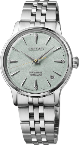 Seiko Presage Cocktail Time. Offering the finest in Japanese mechanical watchmaking, the Presage Collection blends precision technology with superior craftsmanship and design. Offering a graceful and fresh twist to the popular Cocktail Time series, this charming watch, inspired by the Frozen Mojito cocktail, features a lovely light green dial with a stunning pressed pattern evoking crunchy ice. Four diamonds, artfully...