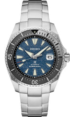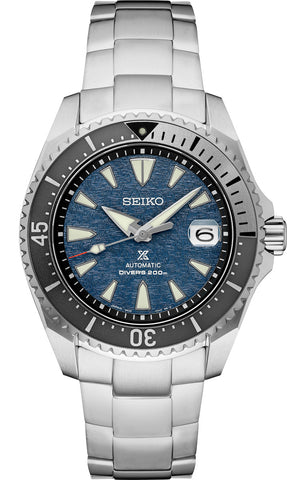 Prospex U.S. Special Edition. Designed for those who treat life as the ultimate adventure, the Seiko Prospex line meets every challenge with technological excellence and style. Part of a rich legacy of innovation in high-intensity timekeeping, Prospex continues to celebrate a long history of sports watch excellence, leading the way with new advances, while re-creating and re-interpreting landmark achievements. Expressing the beauty and mystery encountered by intrepid explorers of underwater caves, this extraordinary design, features a textured blue dial evoking the changing tones of mineral and stone deposits on cave walls, as well as a uni-directional rotating elapsed timing bezel in a subtle two-tone to suggest the duality of light and dark within. Crafted of light and durable titanium, with a scratch resistant super-hard coating, the distinctive case and bracelet are sharply angled, with the precise links creating an arrow shape. The dial includes a date calendar and LumiBrite hands and markers, and is topped by a sapphire crystal with anti-reflective coating on the inner surface, while the screwdown crown and caseback, and tri-fold push button release clasp with secure lock and extender provide secure wear. Following ISO standards for scuba diving to depths of up to 200 meters, this exceptional timepiece offers manual winding capability and includes a 24-jewel automatic movement with a frequency of 21,600 vibrations per hour and a power reserve of approximately 70 hours. 200m Water Resistant