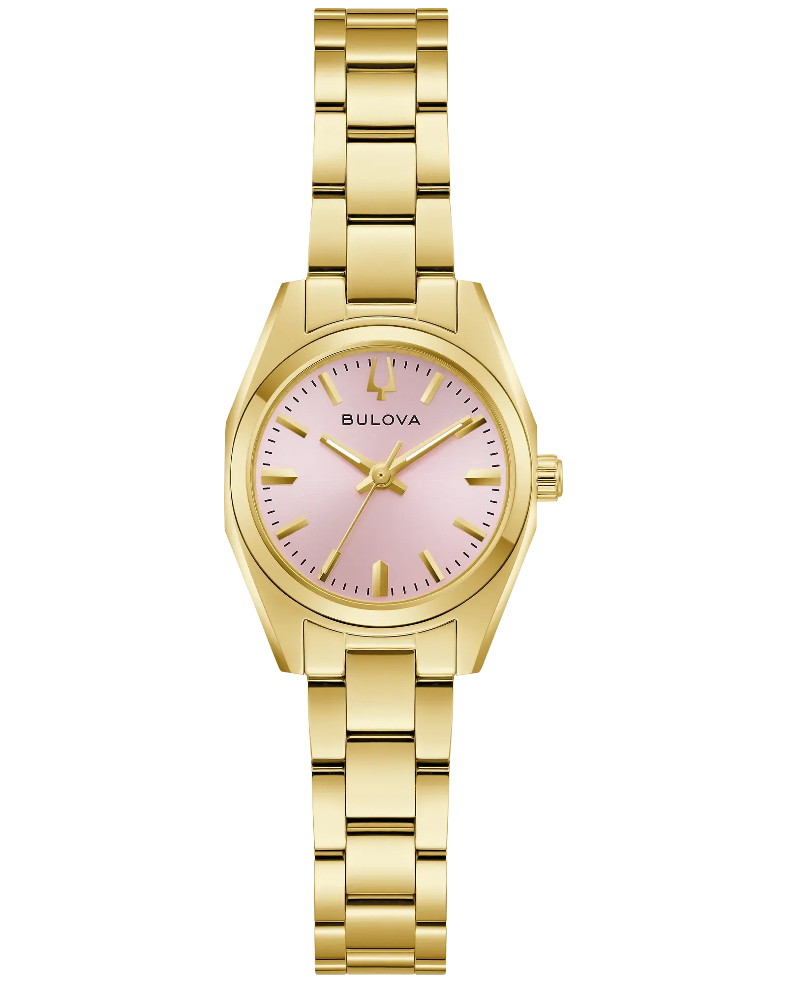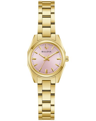 Defined by exceptional quality and sophisticated aesthetics, the Bulova ladies’ Surveyor is the quintessential modern timepiece updated with a mini 23mm case. Sculpted edges and faceting distinguish the gold-tone stainless steel case, with polished and brushed finishing, a flat sapphire crystal, and a matching 3-link gold-tone stainless steel bracelet with a push-button deployant clasp and easy-release latched spring...