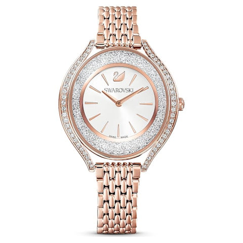 Eminently elegant: This Swarovski watch from our Crystalline Aura Collection artfully combines form and function. More than 1,300 crystals in the rose-gold tone PVD case create a brilliant sparkling effect. A rose-gold tone PVD bracelet and a white silver tone dial with the Swarovski swan at 12 o'clock complete the sophisticated design. This Swiss made watch is water resistant up...