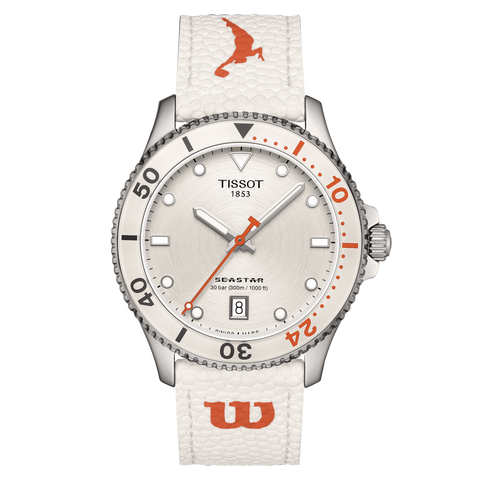 The Tissot Seastar 1000 Wilson WNBA watch is a special edition timepiece designed to celebrate the partnership between Tissot and the Women's National Basketball Association (WNBA). This new edition is powered by a high-quality Swiss Made quartz movement, known for its precision and reliability. This model is accentuated by white and orange details, mirroring the WNBA’s colors. It features a...